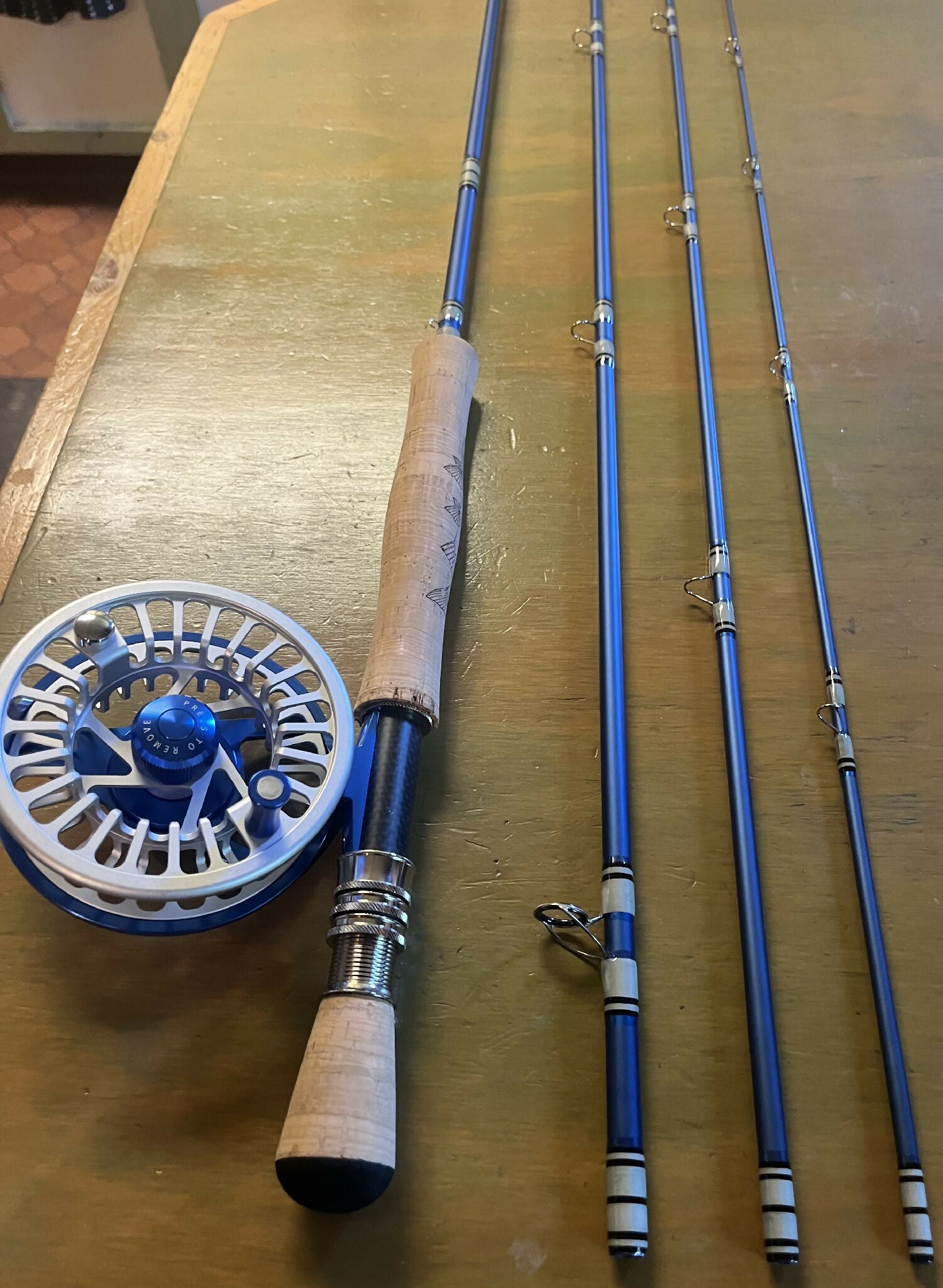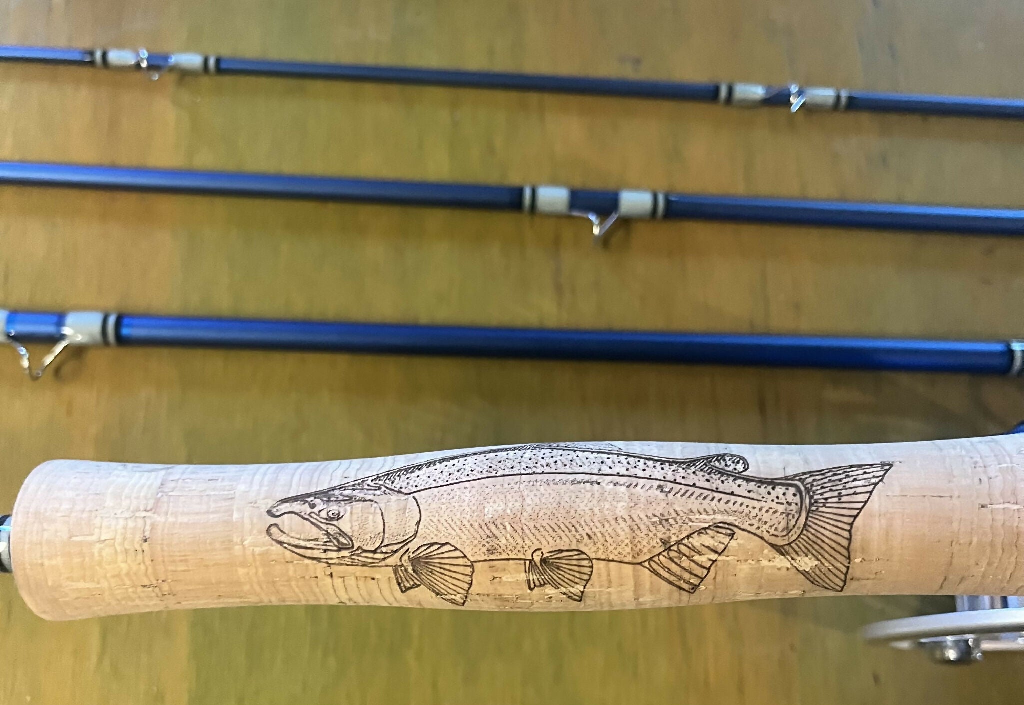 This custom made fly rod was built for big fish and travel. Made with fiberglass, sealed ferrules and saltwater guides, you can find yourself in the salt flats going for Bonefish and in freshwater for King Salmon and Steelhead.