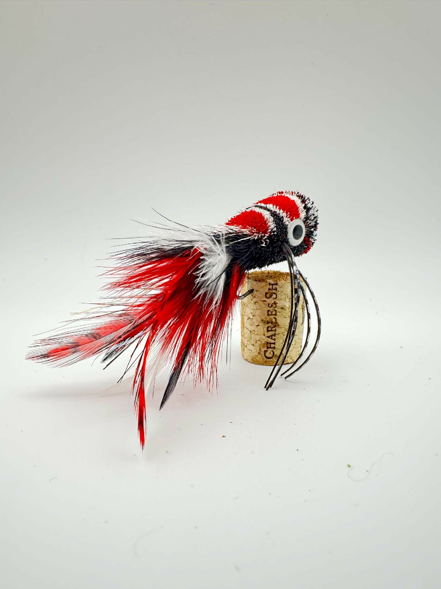 Deer hair popper in red, white and black. Inspired by WWE Superstar Penta. Tied on Ahrex size 2 stinger hook. Tied in Southern Illinois.