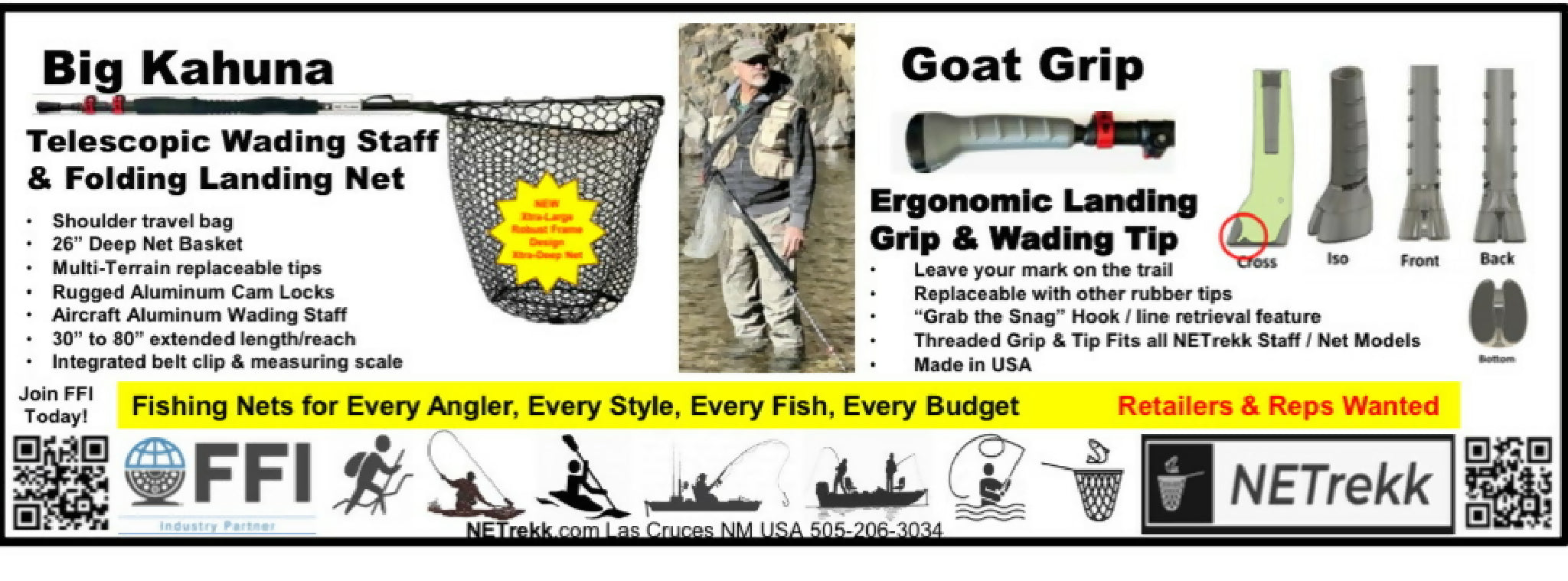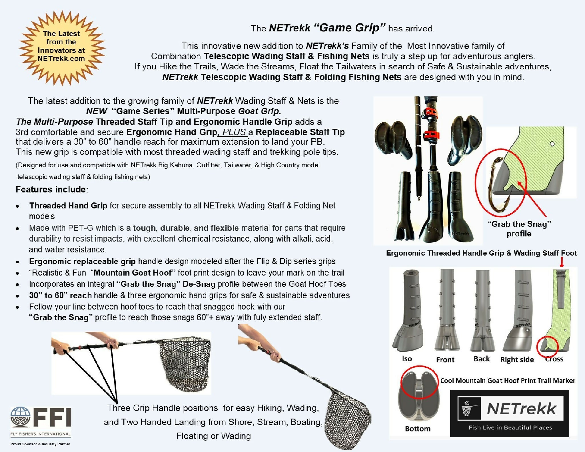 The NETrekk multi-purpose Goat Grip is a fun and useful accessory to compliment the Original NETrekk Wading Staff & Folding Rubber Net series. This handy and effective ergonomic grip & tip is a must have for those who appreciate the value of the long staff as a handle for extended reach when landing your catch.