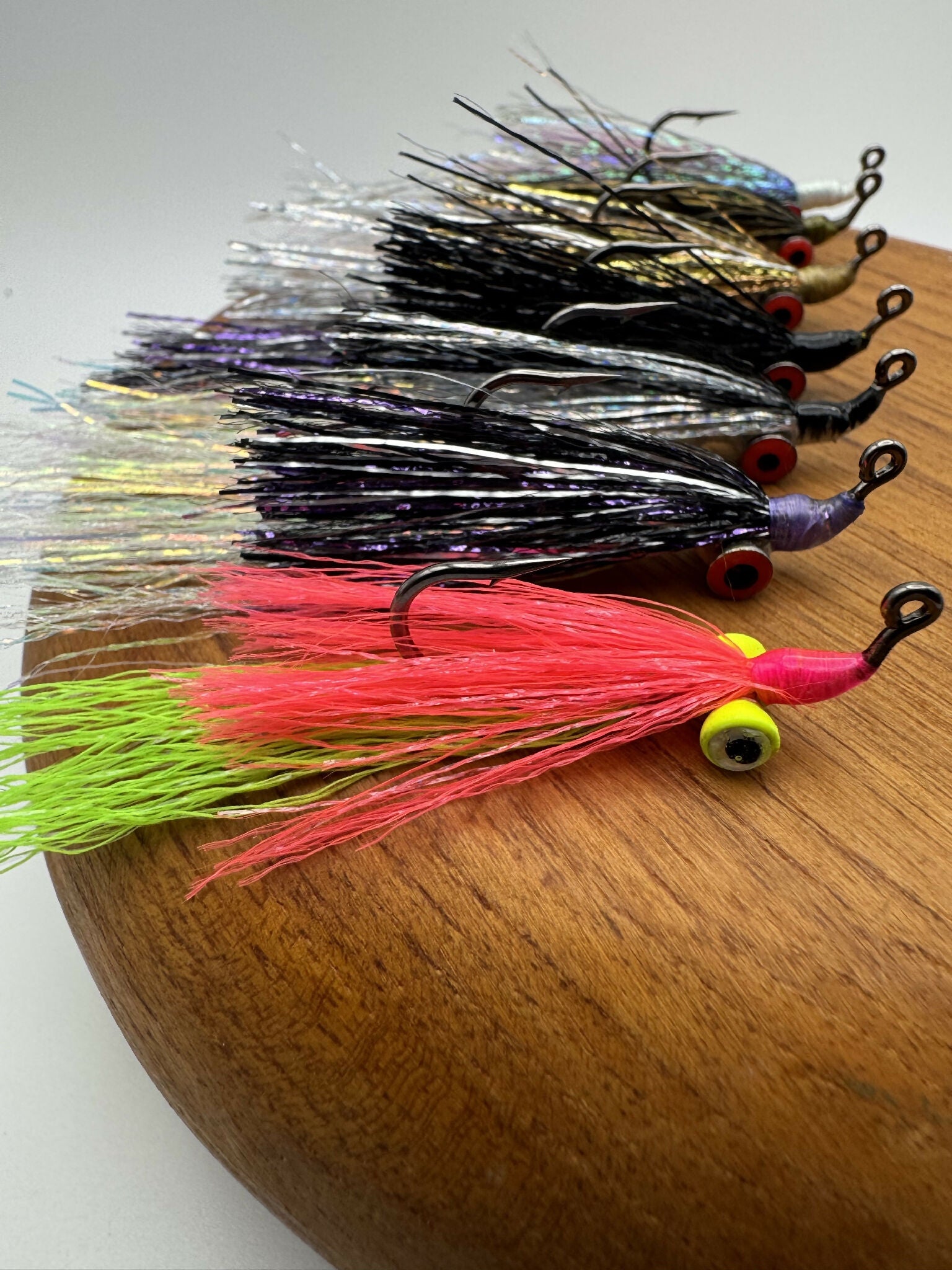 Set of 7 Kreelex minnows. Tied on #2 MFC 60 degree jig hook for great action when stripped. MFC Fish Flash Kreelex material in various colors. Pink/Chartreuse, Pear/Black/Silver, Pearl/Peacock, Purple/Pearl, Olive/Brown/Pearl, Holo Gold/Holo Silver, Purple/Black. Tied in Southern Illinois!