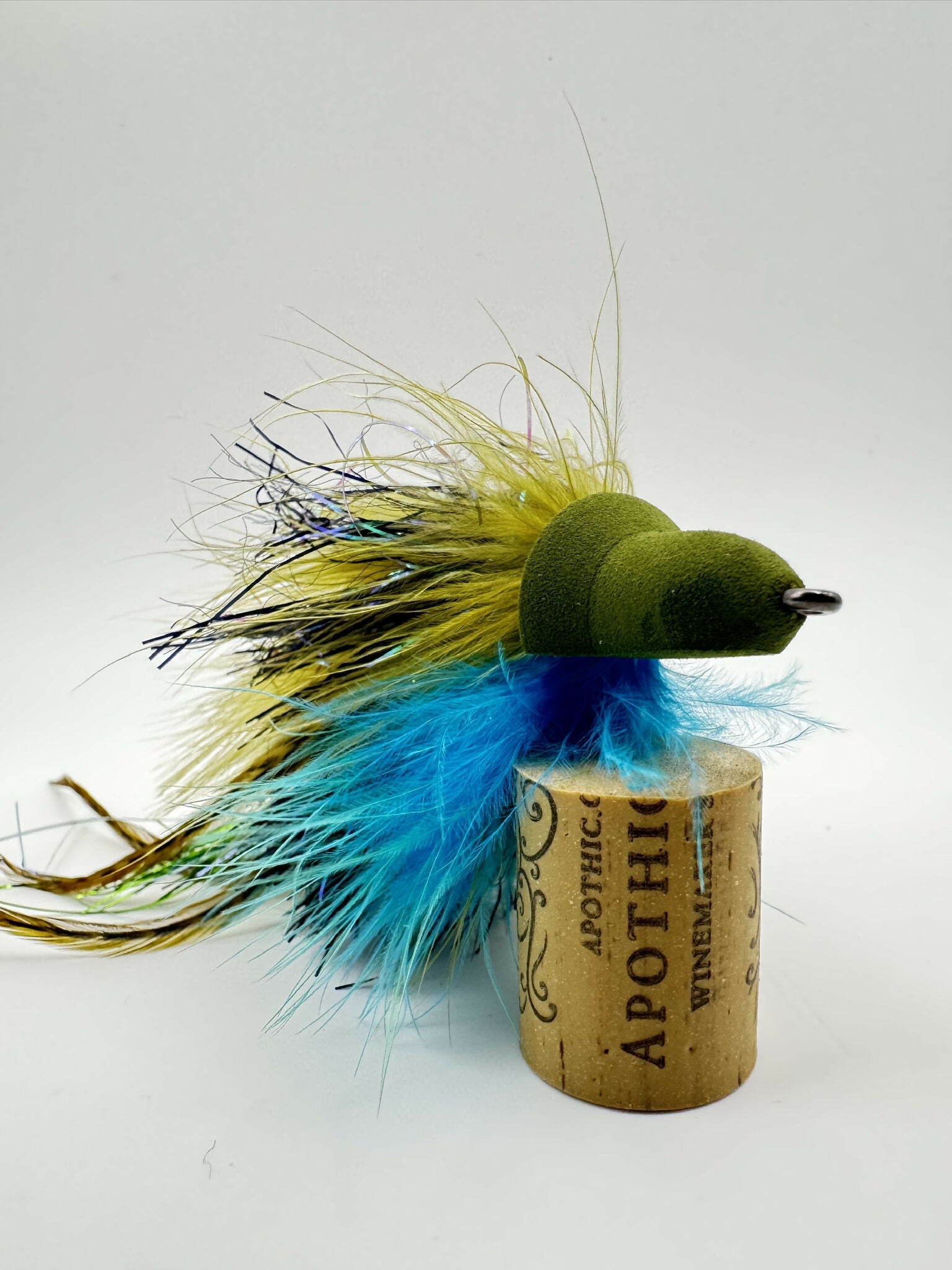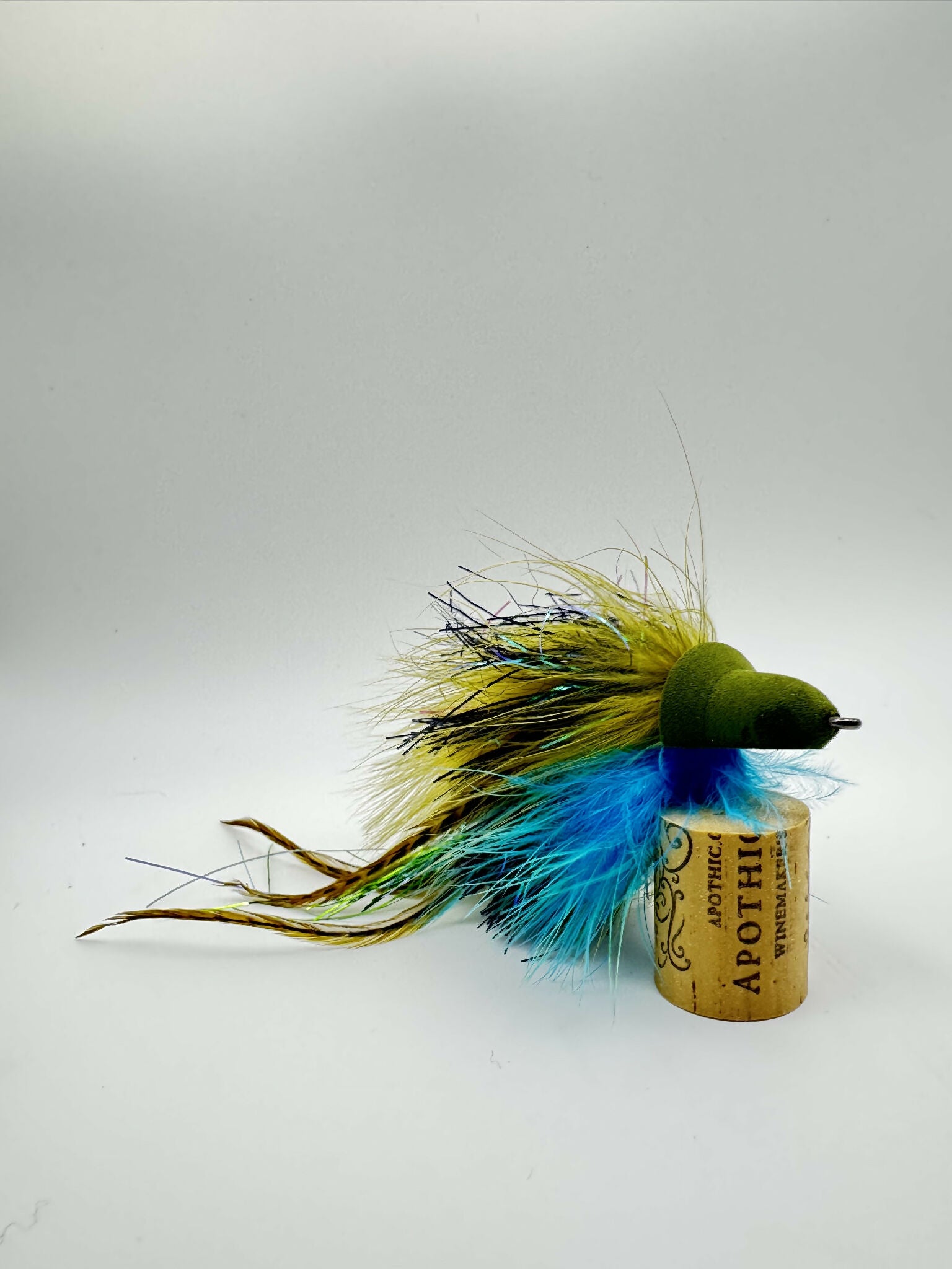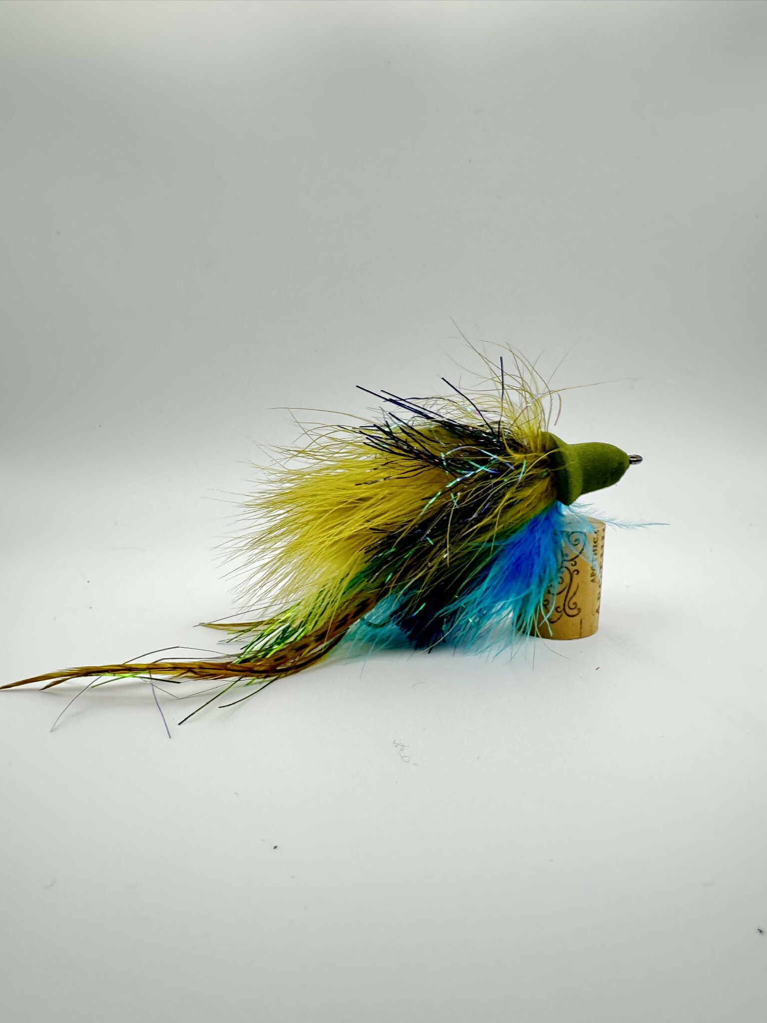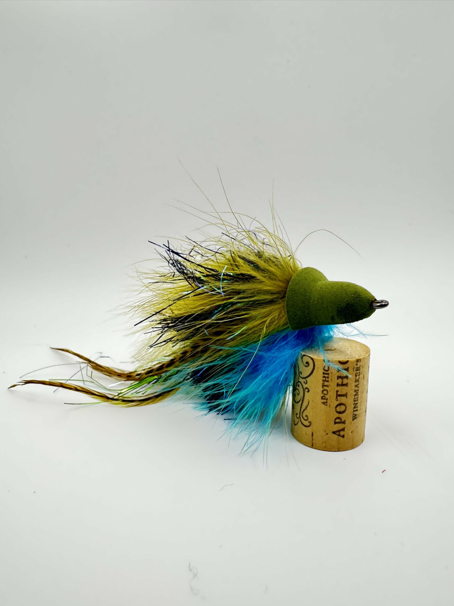 Swingin' D Articulated Fly in Olive and Blue. Front hook size 1/0 Gamakatsu B10S hook, rear hook size 2 Gamakatsu B10S. Foam diver head for great diving and resurfacing action. Rattle to attract extra attention. Great kick and swim action. Bets fished on a sink tip or intermediate line. This thing is a Smallmouth catching machine! Tied in Southern Illinois!